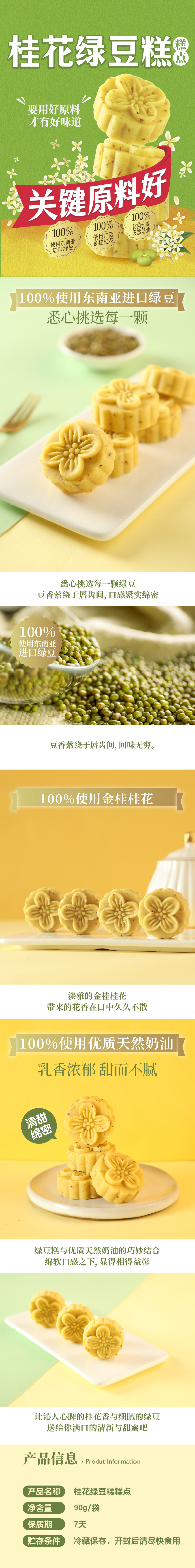 特色原料:100%使用东南亚进口绿豆、100%使用金桂桂花、100%使用优质天然奶油
